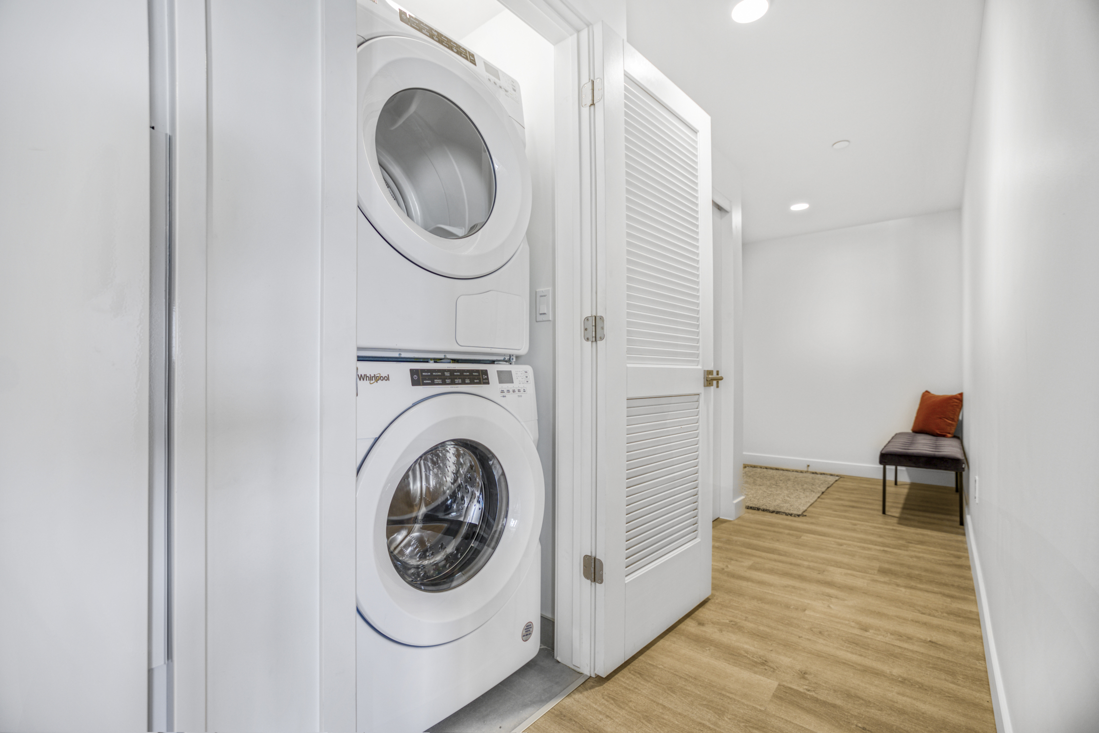 - Matte finish cabinetry with soft-close doors and black hardware
